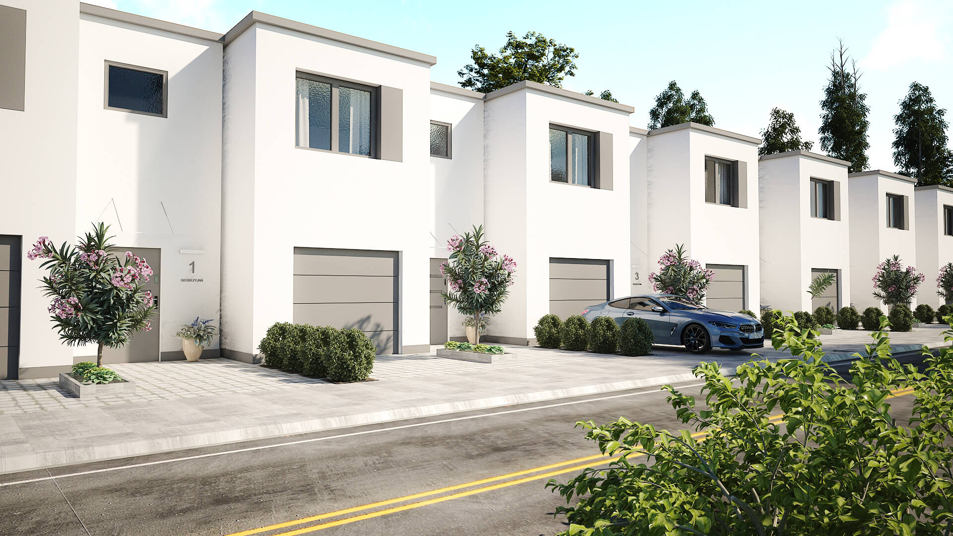 Wnętrze zostało bardzo starannie rozplanowane – na parterze znajduje się salon z aneksem kuchennym i częścią jadalnianą, z którego można wyjść na taras oraz toaleta i wiatrołap. Poddasze podzielono między trzy przestronne pokoje, dużą łazienkę oraz pomieszczenie gospodarcze. W bryłę segmentów wpisano jednostanowiskowe garaże. Elegancka elewacja ma nowoczesny charakter, podkreślony kolorowymi elementami numeracji segmentów.